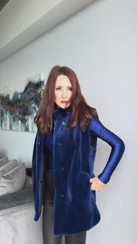 Bold yet versatile, this Cobalt Blue Dyed Sheared Mink Vest is designed with two luxurious looks in one. On the fur side, it showcases sleek, all-over sheared mink in a rich cobalt hue. Reversing to black water-repellent taffeta, it features cobalt mink trim along the collar, front facing, and armholes for a striking contrast.