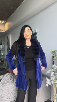 Striking and sophisticated, this Cobalt Blue Sheared Mink Stroller is designed to make a bold statement. Measuring 32 inches long, it features a fitted waist for a flattering silhouette and secure hook-and-eye closure for a sleek finish.