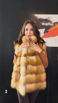 Vibrant and bold, this Red Fox Vest makes a striking statement with its rich natural hues and luxurious texture. Crafted in a horizontal cut design, it highlights the depth and dimension of the fur while offering a modern, structured look.